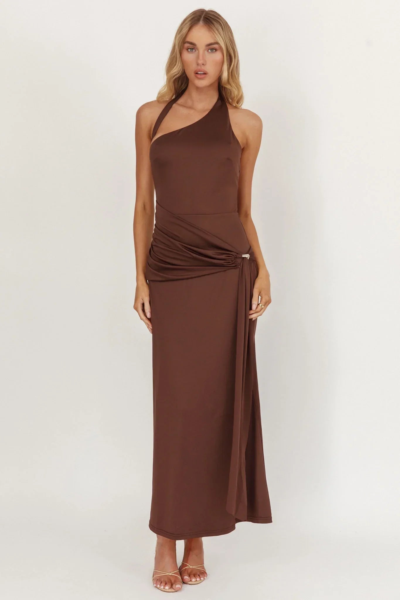 Make them stop and stare in our gorgeous Kimbra midi dress. It features an asymmetric neckline and sash around the waist. It's perfect for a wedding or special event teamed with nude heels and a clutch for a head-turning look we are crushing on.